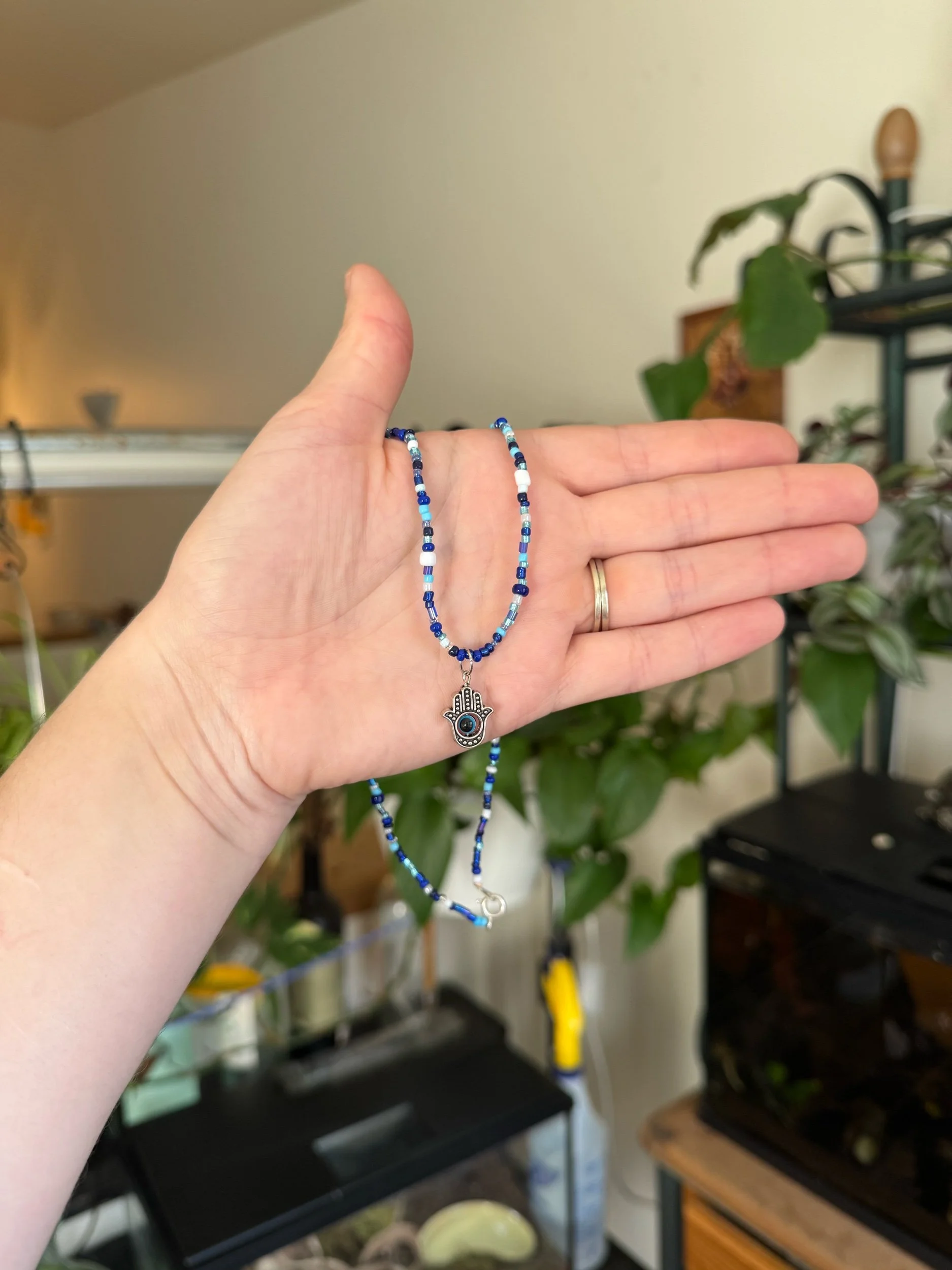 Shop › Hand Eye Necklace Image 1 of 1 Hand Eye Necklace $8.00 Handmade hand eye necklace. Approx 16”-18” long. Add To Cart Added! Handmade hand eye necklace. Approx 16”-18” long.